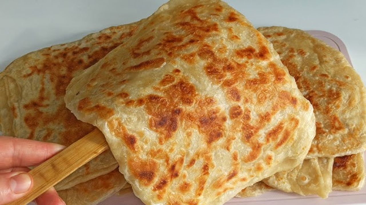Hamur açılır, yağlanarak katlanır ve pişirilir.