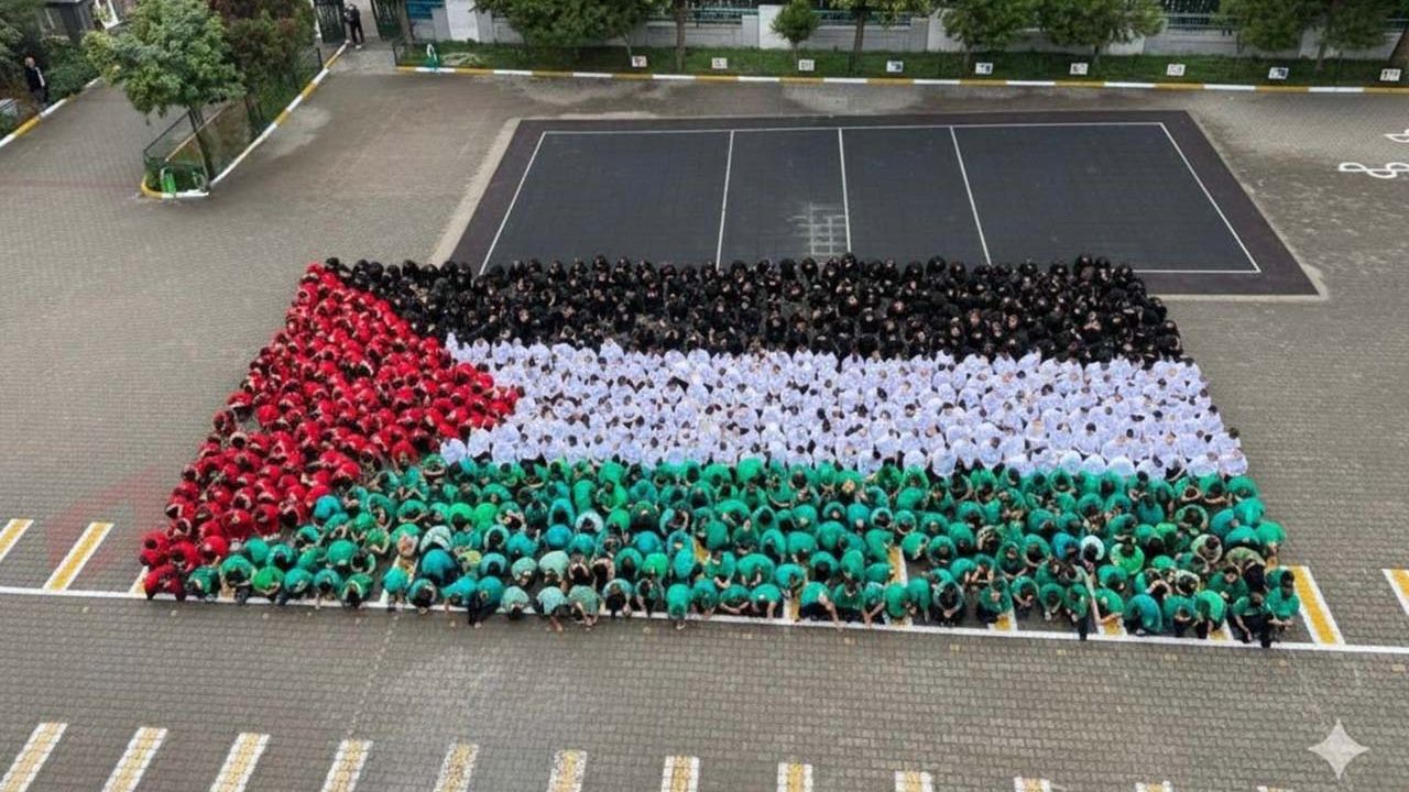Etkinlik kapsamında öğrenciler, Filistin bayrağının renklerini taşıyan kıyafetler giyerek barış, kardeşlik ve dayanışma mesajı verdi. El ele vererek oluşturulan dev Filistin bayrağı, okul bahçesini adeta bir barış sahnesine dönüştürdü.