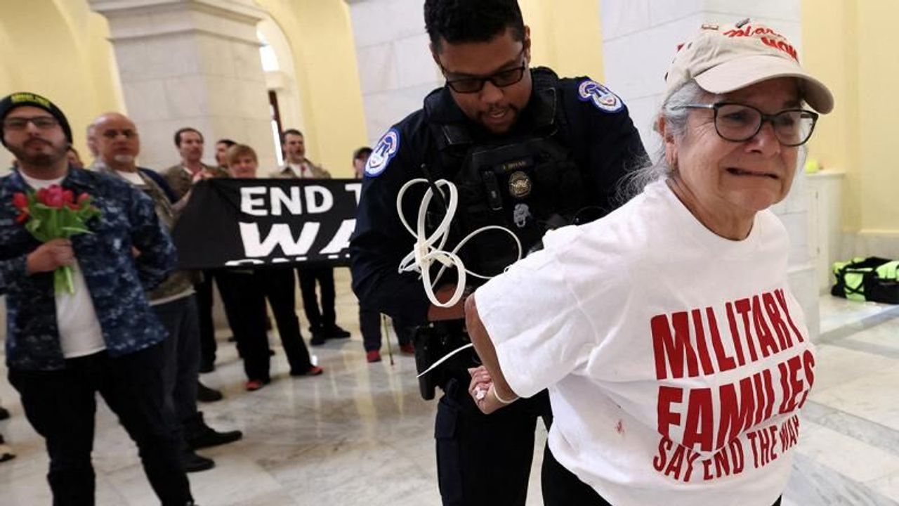 “İran’a karşı savaşa son verin” yazılı pankartlar açan grup, oturma eylemi yaparak savaş karşıtı mesajlar verdi. Sosyal medyaya yansıyan görüntülerde protestocuların, hayatını kaybeden 13 ABD askerini temsilen bayrak katlama töreni düzenlediği ve sloganlar attığı görüldü.