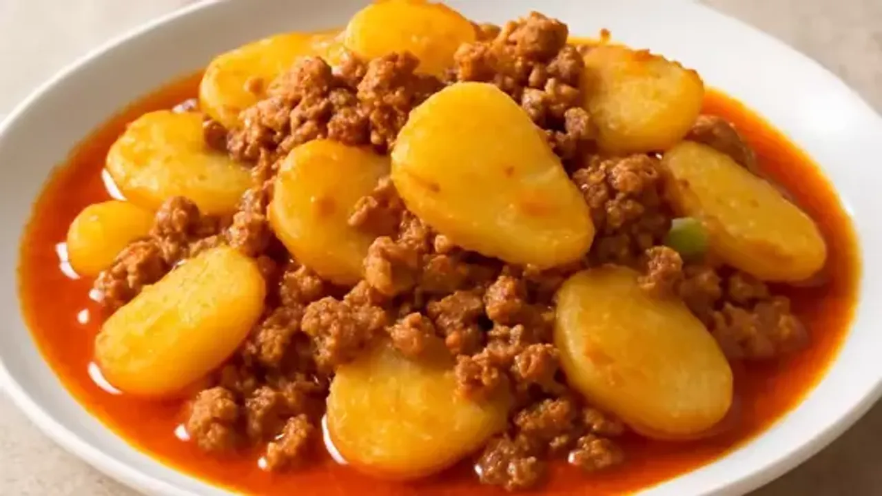 Malzemeler 3 patates 200 g kıyma 1 soğan 1 yemek kaşığı salça Tuz, karabiber Yapılışı Soğan ve kıymayı kavurun. Salçayı ekleyin. Patates ve su ilave edip pişirin.