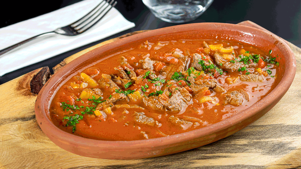 Soğanı yağda kavurun, eti ekleyip mühürleyin. Doğranmış biber, domates ve sarımsağı ekleyin. Baharatlarla tatlandırıp kısık ateşte et yumuşayana kadar pişirin. Sıcak servis edin.