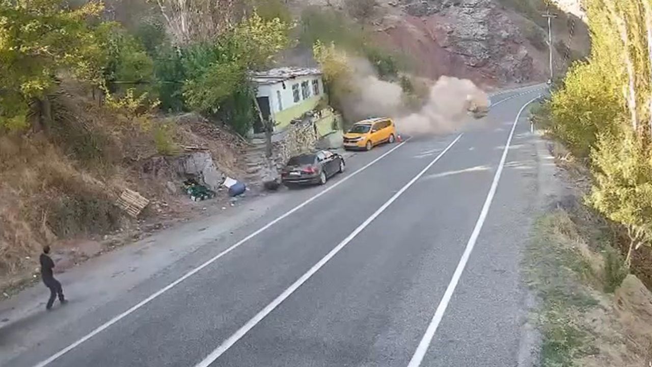 Olay, Tunceli-Erzincan karayolu Kutu Deresi mevkiinde meydana geldi. Edinilen bilgiye göre, dağlık alanda kepçenin çalışma yaptığı sırada, kopan büyük bir kaya parçası aşağı doğru yuvarlanmaya başladı. Kaya parçası dağ eteğindeki evi ve yol kenarında park halindeki 2 aracı teğet geçerek dereye yuvarlandı. O sırada bir şahıs koşarak kaçmaya başladı ve yere düştü. Büyük bir facianın eşiğinden dönüldüğü olay, güvenlik kameralarına yansıdı.