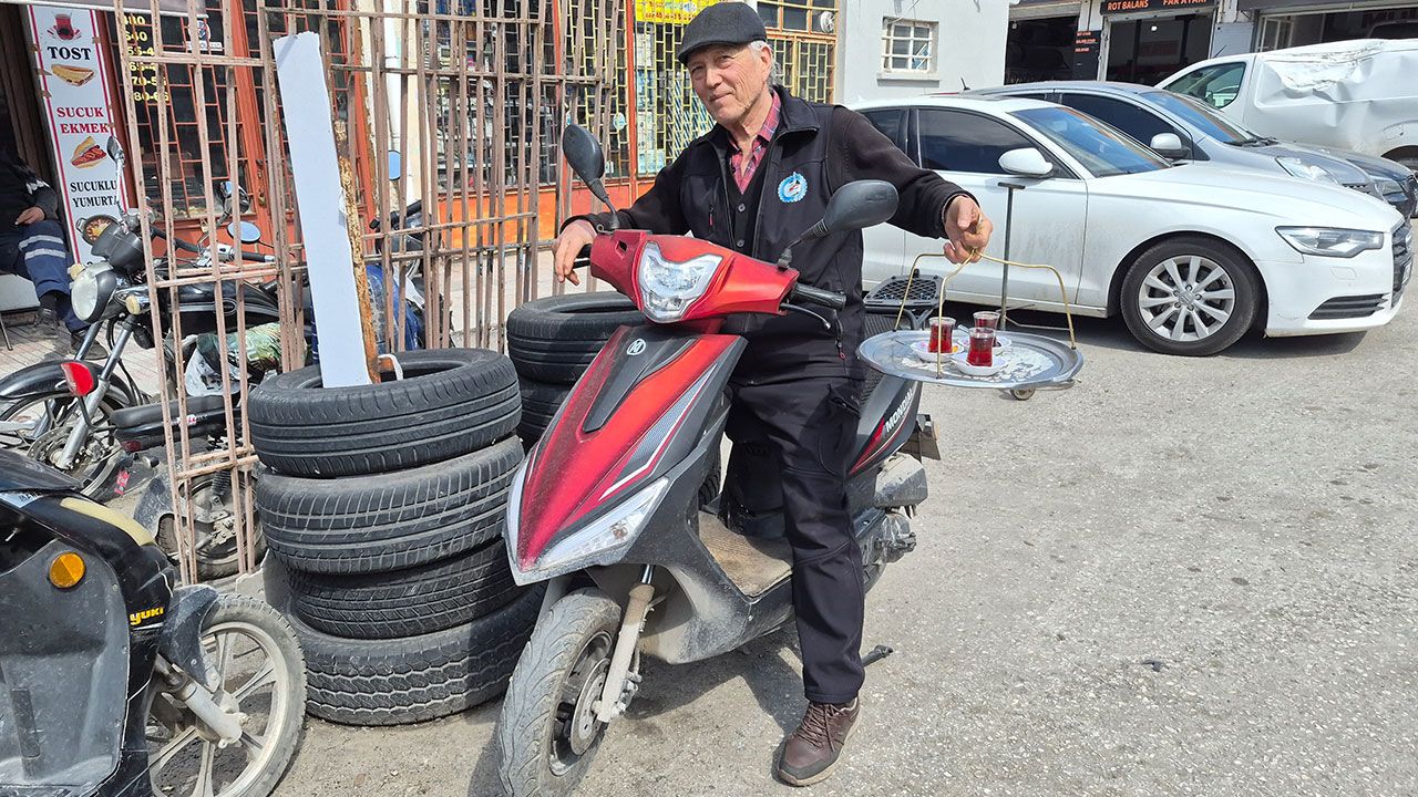 Baba mesleğini sürdüren Cahit Çandemir, Eskişehir Küçük Sanayi Bölgesi'nde çay ocağı işletiyor. Çevredeki işletmelere ve dükkanına gelen müşterilere hizmet veren Çandemir, işini kolaylaştırmak için elektrikli bisikletle dağıtım yapıyor. Bir eline çay bardaklarıyla dolu tepsiyi alıp diğer eliyle kullandığı elektrikli bisikletinin 2 elemana denk olduğunu söyleyen esnaf, ilginç çalışma yöntemi ile dikkat çekiyor.