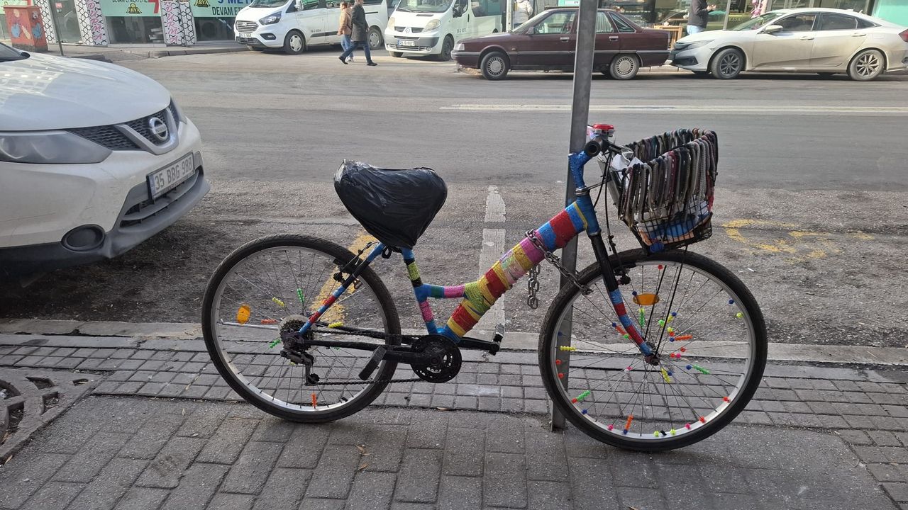 Kaldırım kenarında bulunan bisikletin farklı renklerle süslendiği görülürken, alışılmışın dışındaki görüntüsüyle cadde üzerindeki yaya ve sürücülerin ilgisini çekti. Direğe bağlı halde duran bisiklet, çevrede kısa süreli duraklamalara neden oldu.