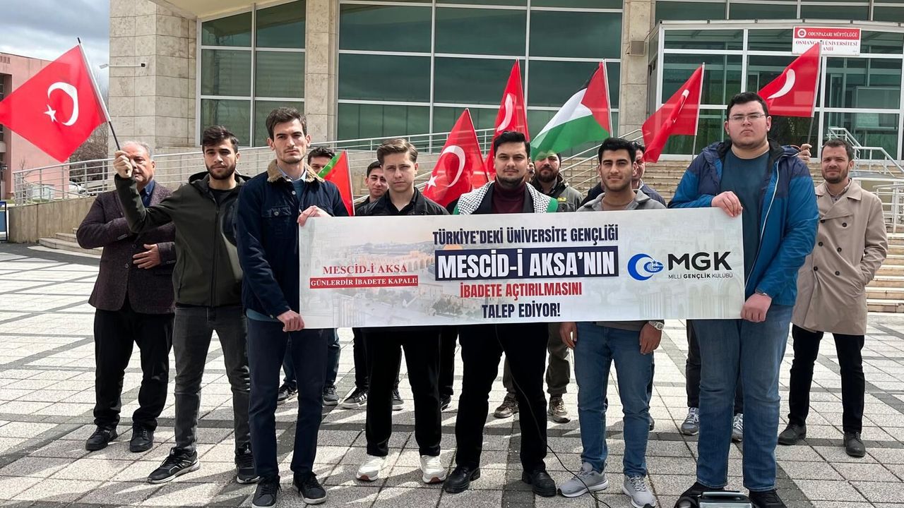 Milli Gençlik Kulübü adına konuşan Cihat Emre Keskin, Eskişehir Osmangazi Üniversitesi yerleşkesinde bulunan İlahiyat Camii’nde basın açıklaması yaptı. Açıklamada, Mescid-i Aksa’ya yönelik uygulamalara ilişkin değerlendirmelerde bulunuldu.