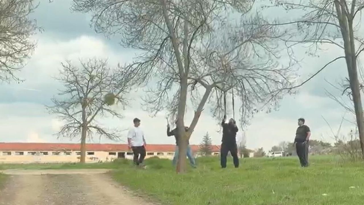 Birinin elinde balta da bulunan şahısların mangal için ağaca zarar vermeye çalıştığı iddia edildi. Gruptan bir başka şahsın ağaç dalına balta salladığı görüldü. Dala takılan ipe asılan şahısların uğraşı ‘pes' dedirtti.