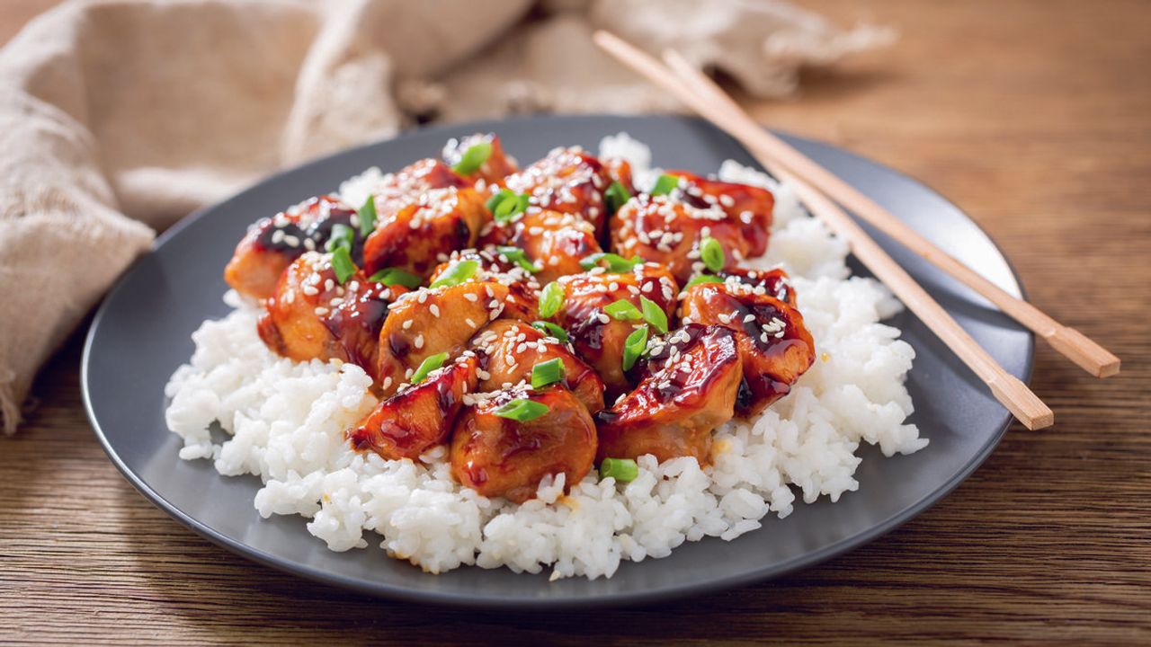 Tavukları tavada kızartın. Sos malzemelerini ekleyin. Sos koyulaşana kadar pişirin. Susam serpip pilavla servis edin.