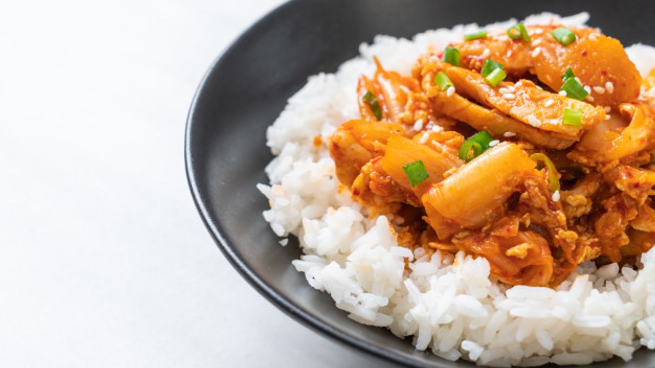 Kimchiyi yağda soteleyin. Pilav ve soya sosunu ekleyin. Ortasını açıp yumurtayı kırın, pişince karıştırın. Taze soğanla servis edin.