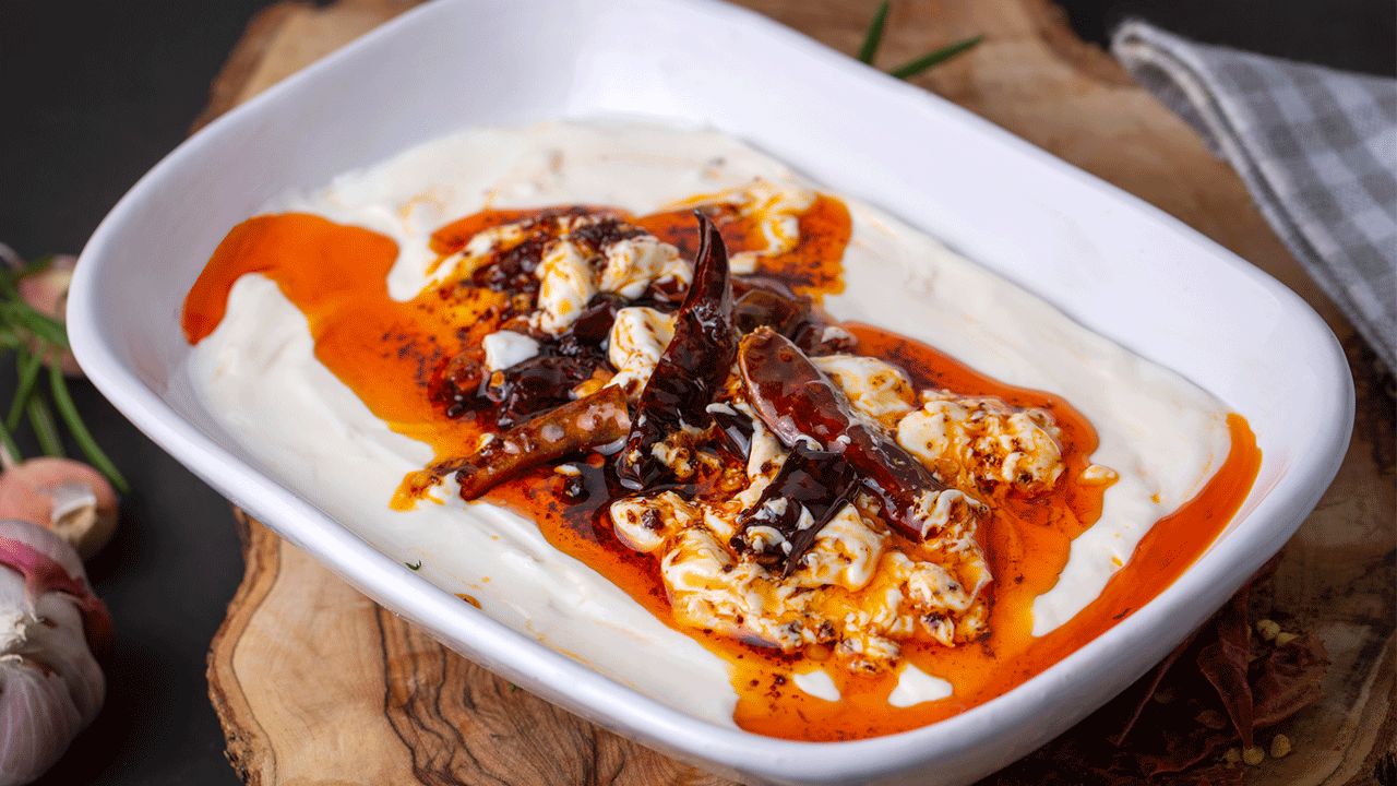 Yoğurt ve sarımsak karıştırılır. Üzerine kızdırılmış tereyağı ve pul biber dökülür.