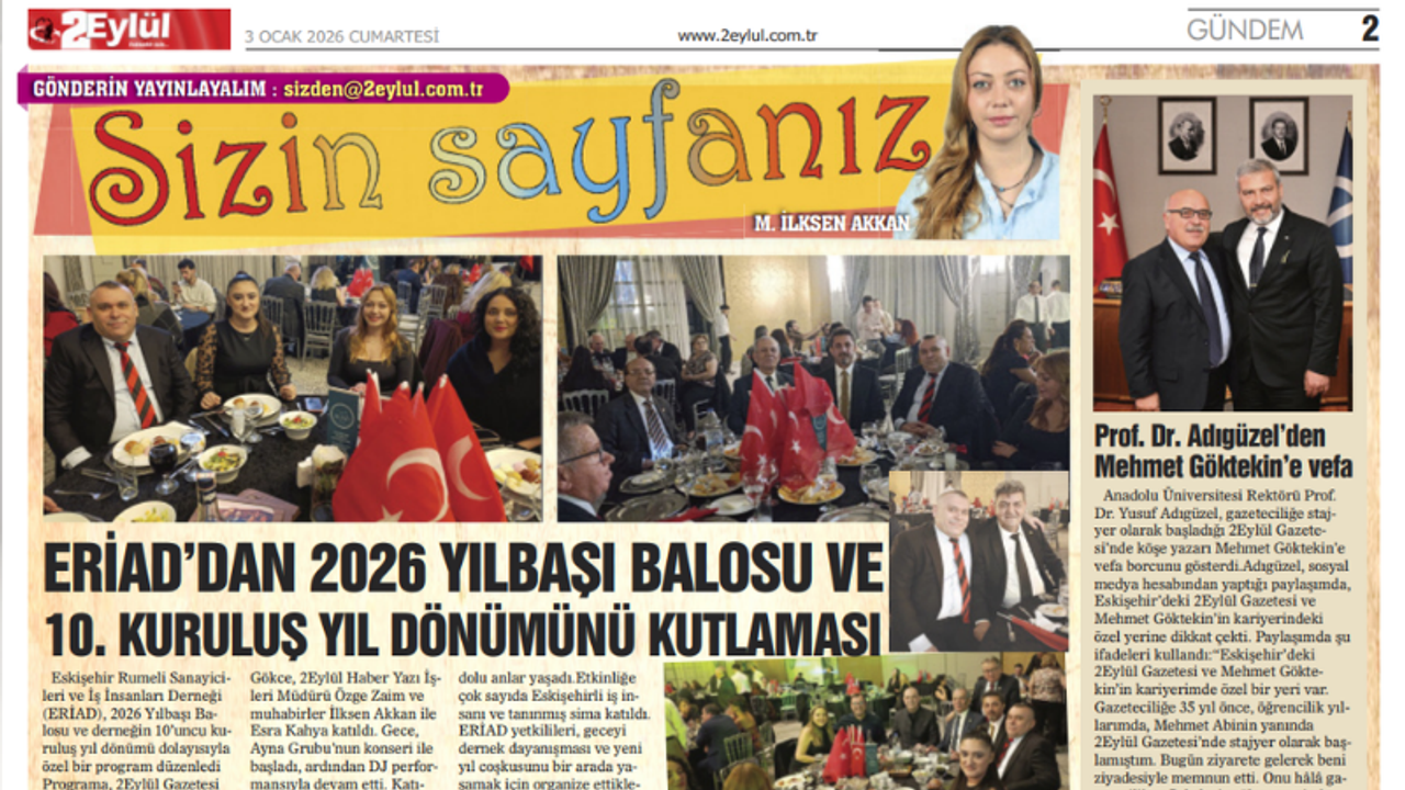 Eskişehir Rumeli Sanayicileri ve İş İnsanları Derneği (ERİAD), 2026 Yılbaşı Balosu ve derneğin 10’uncu kuruluş yıl dönümü dolayısıyla özel bir program düzenledi Programa, 2Eylül Gazetesi Genel Koordinatörü İlker Gökce, 2Eylül Haber Yazı İşleri Müdürü Özge Zaim ve muhabirler İlksen Akkan ile Esra Kahya katıldı. Gece, Ayna Grubu’nun konseri ile başladı, ardından DJ performansıyla devam etti. Katılımcılar müzik ve eğlence dolu anlar yaşadı. Etkinliğe çok sayıda Eskişehirli iş insanı ve tanınmış sima katıldı. ERİAD yetkilileri, geceyi dernek dayanışması ve yeni yıl coşkusunu bir arada yaşamak için organize ettiklerini belirtti.