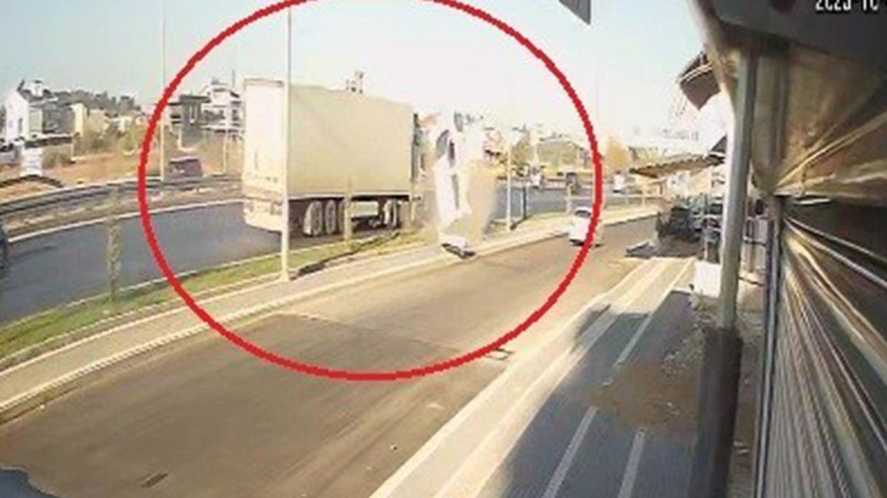 Görüntülerde, sol şeritteki hafif ticari aracın aniden sağ şeride geçmeye kalktığı sırada tırın tamponuna dokunarak takla atarak ters durduğu görüldü. Öte yandan, takla atarak ters dönen hafif ticari araçtan yola bir av tüfeği düştüğü gözlendi.