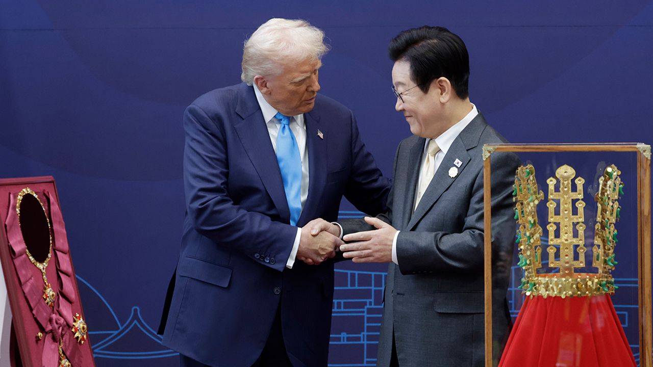 Japonya’daki diplomatik temaslarını tamamlayan ABD Başkanı Donald Trump, Asya turunun 3’üncü durağı olan Güney Kore’ye geldi. Trump’ı taşıyan uçak yerel saatle 11.30 sıralarında Busan'daki Gimhae Uluslararası Havalimanı'na iniş yaptı. Güney Kore Dışişleri Bakanı Cho Hyun ve ABD Büyükelçisi Kang Kyung-hwa tarafından askeri törenle karşılanan Trump için bir devlet başkanına gösterilen en yüksek nezaket seviyesi olan 21 pare top atışı yapıldı. Marine One helikopteri ile buradan ayrılan Trump, daha sonra Gyeongju şehrinde Güney Kore Devlet Başkanı Lee Jae Myung tarafından karşılandı. Gyeongju Ulusal Müzesi'nde ziyaretçi defterini imzalayan Trump’a, Güney Kore'nin en yüksek devlet onuru olan "Mugunghwa Büyük Nişanı" takdim edildi. Trump’a ayrıca ülke tarihinde önemli bir yeri bulunan Cheonmachong altın tacının bir replikası verildi. Trump ve Lee, törenin ardından gerçekleştirecekleri ikili görüşmeye geçti.